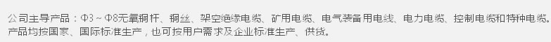 公司目前產(chǎn)品有:Φ3~Φ8無氧銅桿、銅絲、1-35kV裸電線、電氣裝備用電線、電力電纜、控制電纜和特種電纜。產(chǎn)品均按國家、國際標準生產(chǎn),也可按用戶需求及企業(yè)標準生產(chǎn)、供貨。